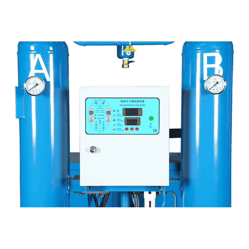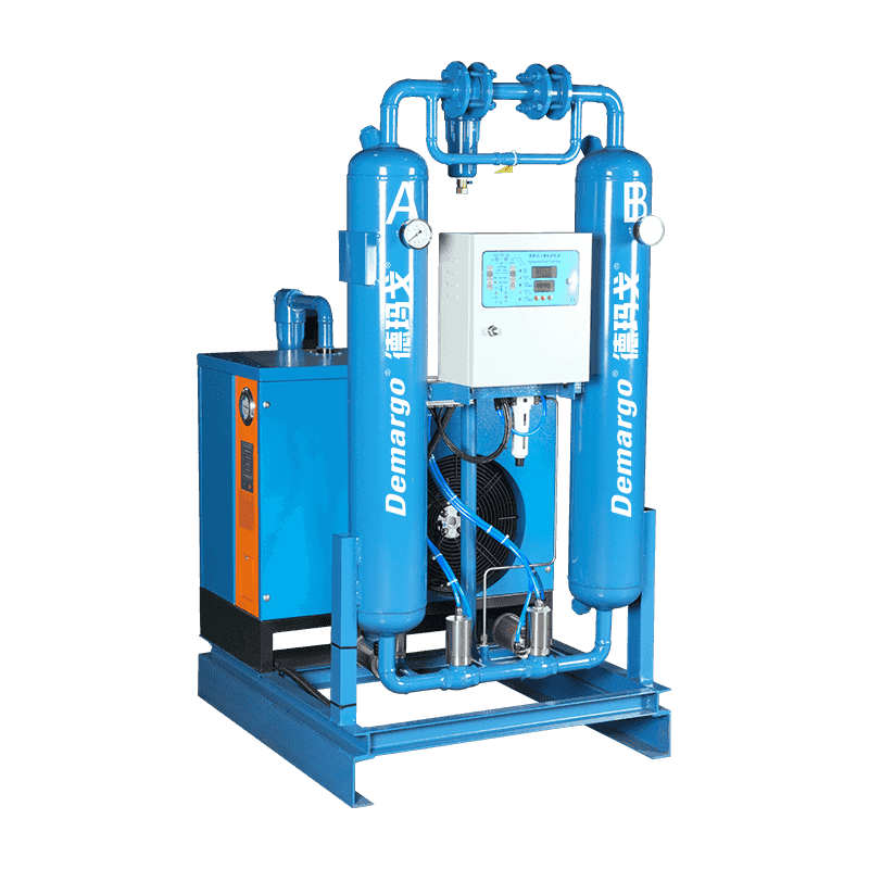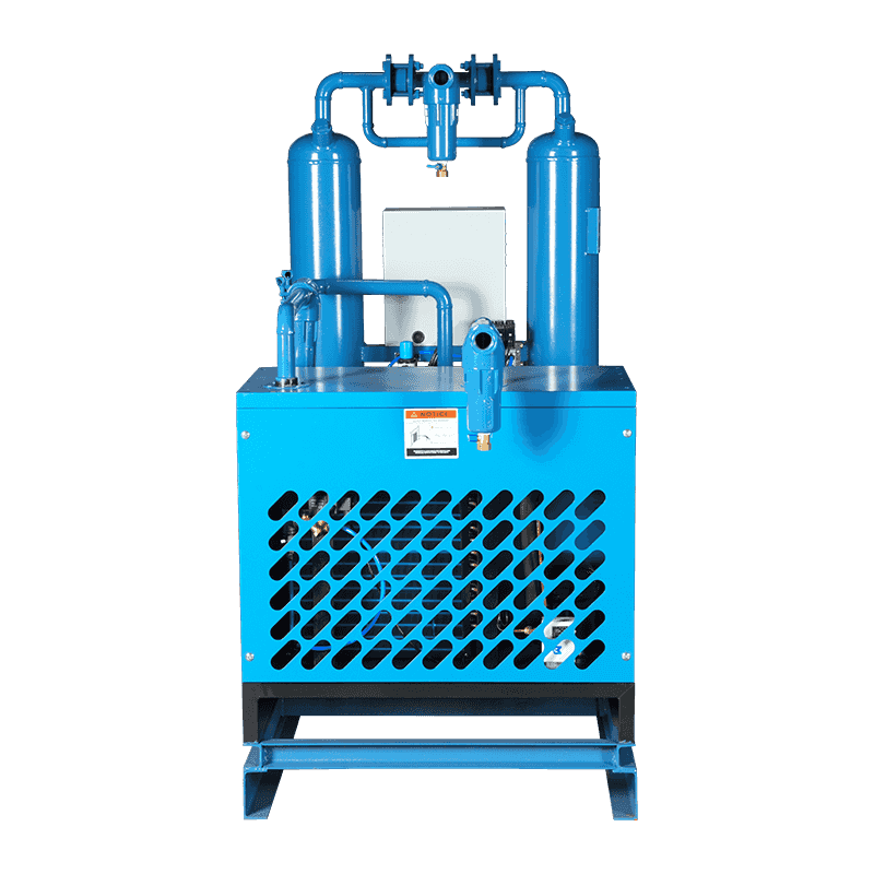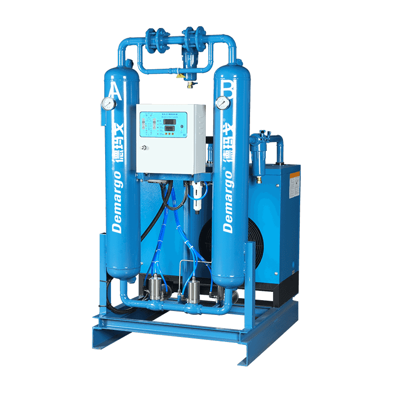 熱のないコンビネーションマシンでは、圧縮空気が最初に冷たい乾燥機の前輪に入り、乾燥した圧縮空気の温度が上昇し、同時に蒸発器に入る圧縮空気の温度が低下し、水の一部が除去され、蒸発器のワークロードを削減するために、蒸発器に入る温度が低下します。次に、熱交換用の蒸発器に入り、圧縮空気が約5°Cの露点温度に冷却されます。水、油、および圧縮空気中のいくつかの不純物はここで凝縮され、空気と水は空気水分離器によって分離され、その後、自動排水器を通して水と油が排出されます。乾燥した圧縮空気は、オイル除去フィルターを介して乾燥機に入り、要件を満たす露点温度まで水をさらに除去します。次に、乾燥機から出てくる乾燥圧縮空気をダスト除去フィルターで除去して、乾燥機によって生成された少量のダストを除去し、冷たい乾燥機の前輪に戻して高温で湿った空気を冷却して、それ自体の温度を高めることができます。同時に、加熱された乾燥圧縮空気は、凸パイプラインで凝縮が発生するのを防ぐこともできます。
